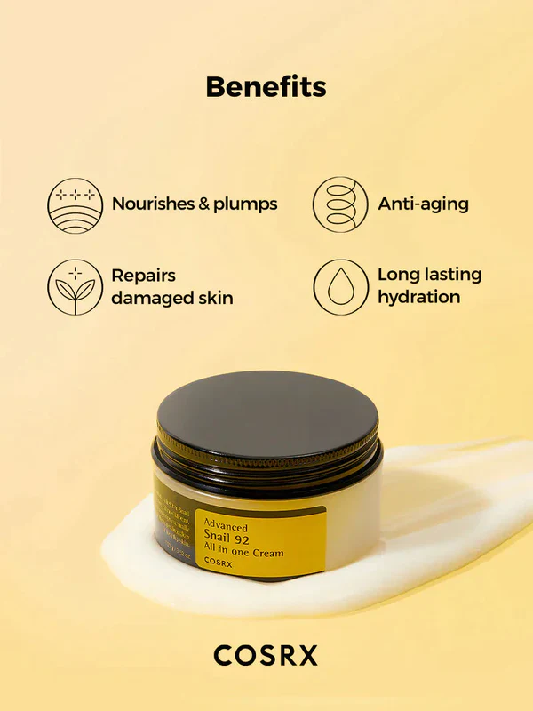 Απολαύστε την απόλυτη φροντίδα του δέρματός σας με την COSRX Advanced Snail 92 All in One Cream. Μια super ενυδατική κρέμα με μοναδική τζελ υφή, εμπλουτισμένη με 92% φιλτραρισμένη βλέννα σαλιγκαριού που βελτιώνει την ελαστικότητα και την υφή του δέρματος.